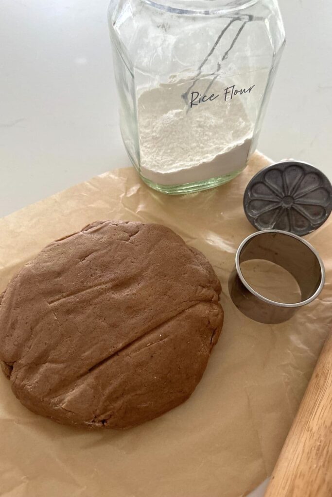 - Lightly dust a clean surface with rice flour and roll out your sourdough biscoff cookie dough to around 5mm thick. You can use an embossed rolling pin to pattern the dough if you have one. Otherwise, use a cookie cutter of your choice to cut out as many cookies as you can.