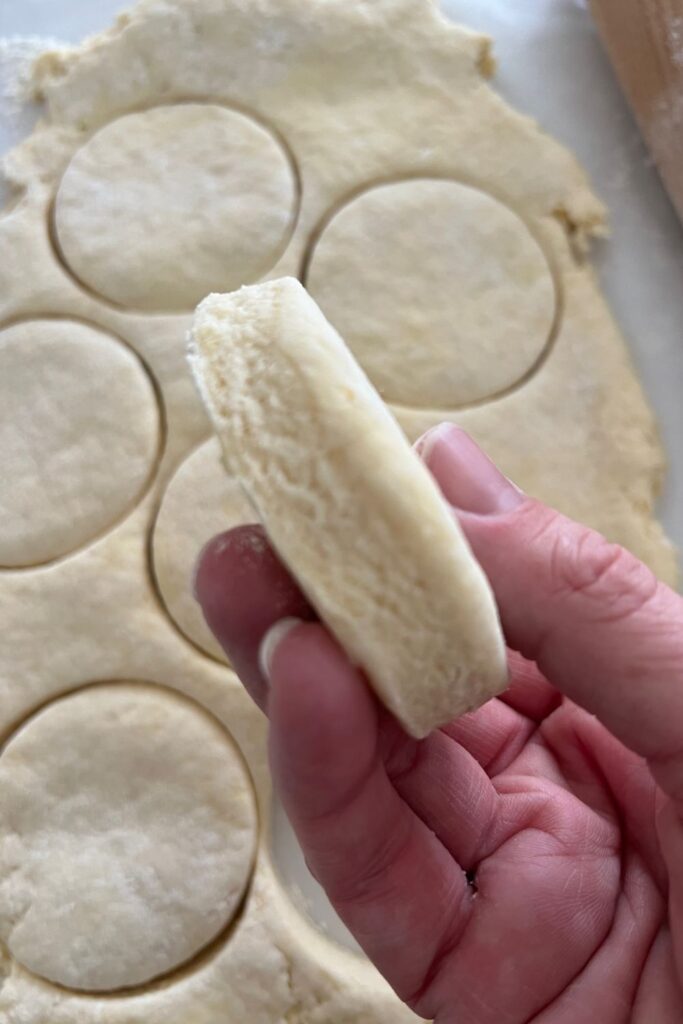 - For the flakiest, tallest biscuits, you can cut the dough into four strips and stack them on top of each other before you roll the dough out. This will give you plenty of layers when they rise.