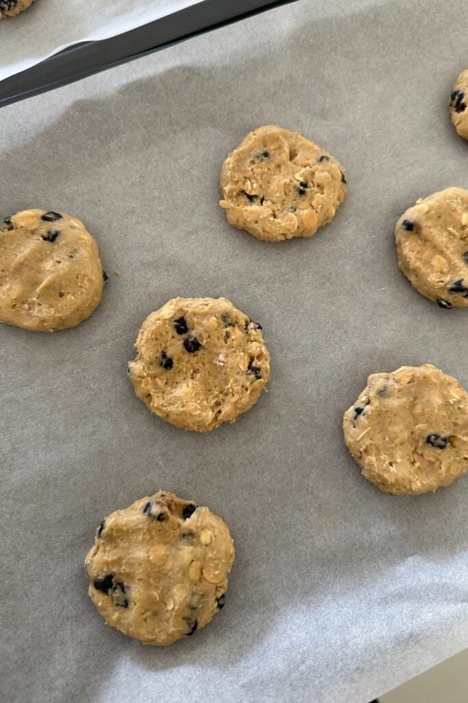 - Scoop out portions of dough that weigh around 40g (I made 16 cookie dough balls weighing 40g each). Put each ball of dough onto the cookie sheet and push down a little with your fingers to flatten.