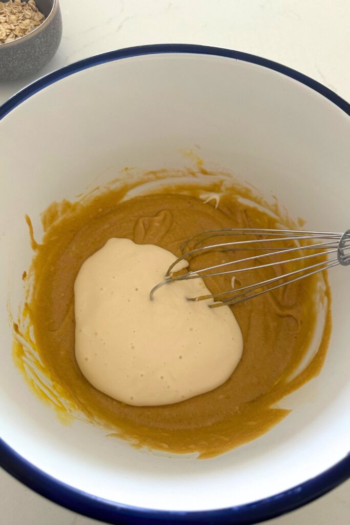 - To a medium sized mixing bowl, add the melted butter, brown sugar, egg and vanilla extract. Whisk until lighter in color and texture.