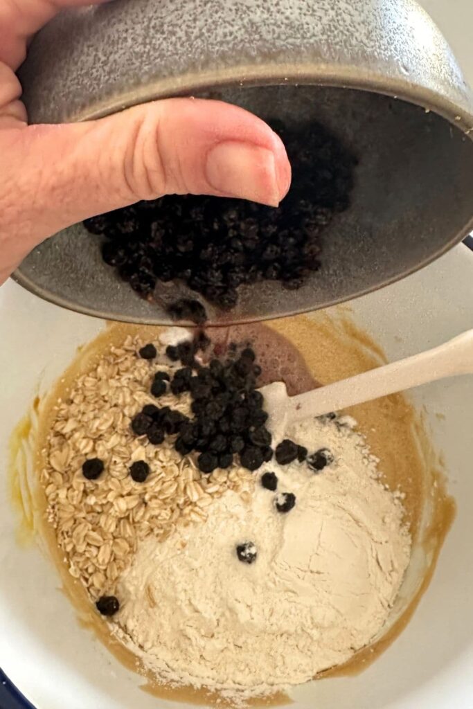 - To the top of this mixture, add the all purpose flour, rolled oats, baking soda, salt and the dried blueberry and lemon mixture. You might see the baking soda fizz as the lemon juice hits it.