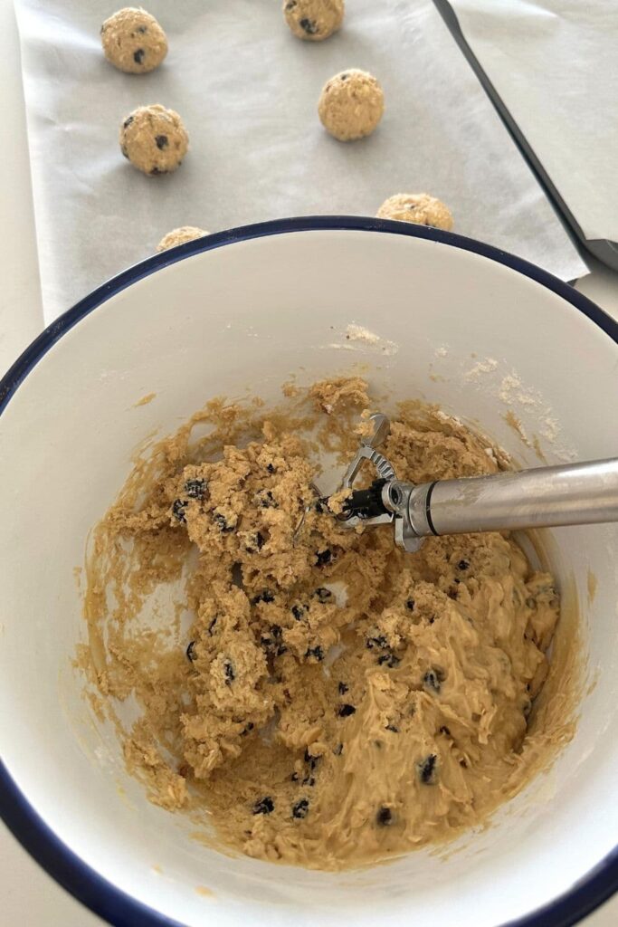 When you're ready to bake the cookies, preheat the oven to 170C (340F). Line two cookie sheets with parchment paper and grab a cookie scoop.