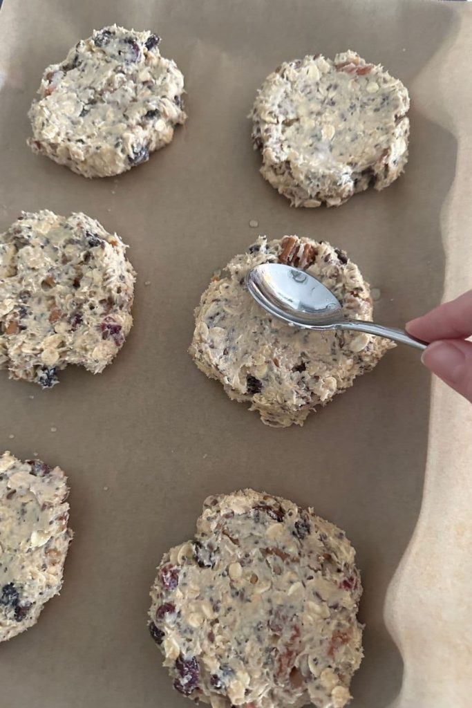 Using your hands, form the mixture into 8 large balls of cookie dough. Place the balls onto the lined cookie sheet you prepared earlier. Gently press them down with the back of a spoon.I've made them 100g each but you can really make them any size you like. The smaller you make them, the more cookies you'll get but I like the jumbo sized for a grab and go breakfast.