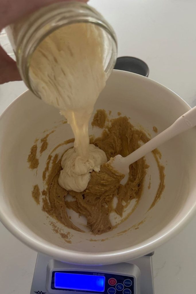 - Now add the sourdough starter and whisk well to combine with the butter, sugar and honey.