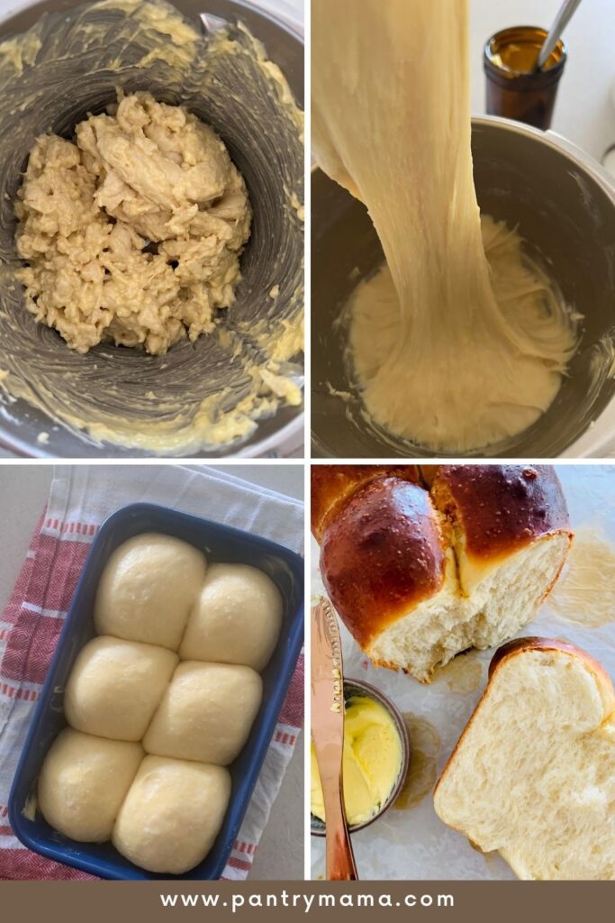 We love the flavor and structure of this bread! I've made it as buns several times, and tried the loaf once. Complications have arisen from baking at a mile altitude - the loaf sank a bit and was underdone in the middle. I've been baking at 375 C, and still barely get the tops to brown even with a milk/yolk egg wash.