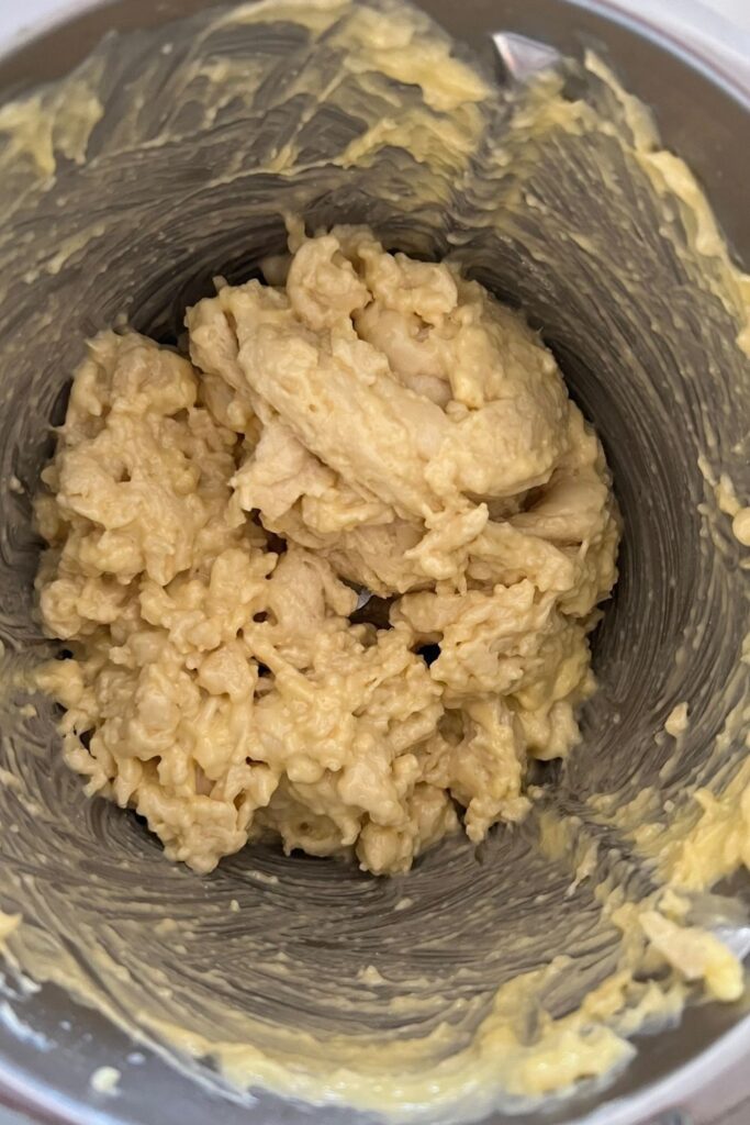 I keep the mixer going and after 8 to 10 minutes it eventually comes together and becomes beautiful and silky.