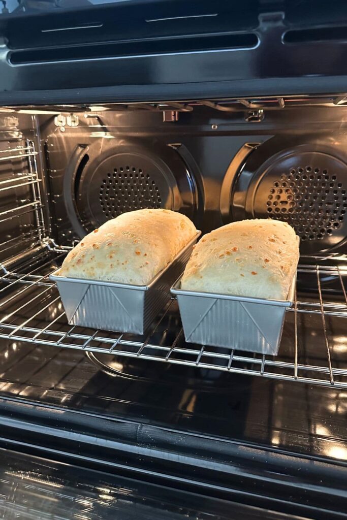 I allow the loaf to rise so that it is above the lip of the pan before I bake it and this ensures that the dough is properly risen and will give you a light, fluffy interior.
