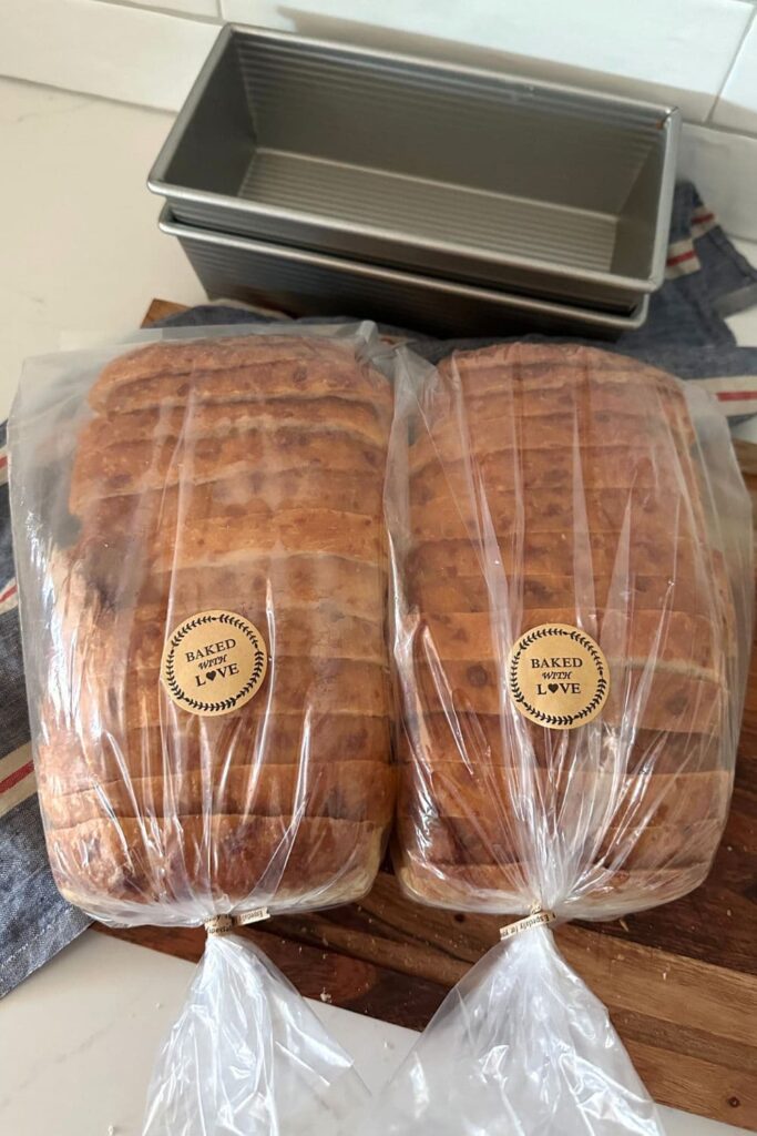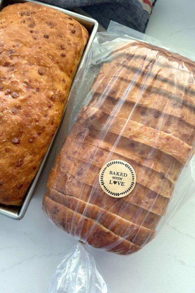If we are using the loaf as fresh bread, it's best to use within 24 hours. I store in the same clear plastic bags as I freeze the loaf in and it stays fresh for up to 24 hours. After that, it's best toasted.