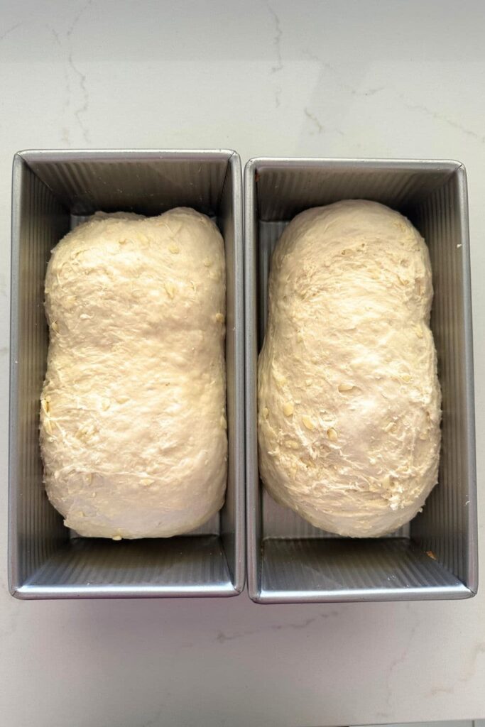 If you want to hit pause on this recipe, you can place your sandwich loaf in the fridge once it's shaped. I allow the loaf to rise around half way up the tin and then put them it the fridge for up to 12 hours. When I want to bake it, I take it out, allow it to rise over the lip of the pan and then bake.