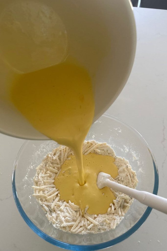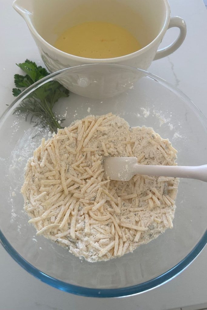In a separate bowl mix together shredded cheese, all purpose flour, salt, baking powder, salt and chopped herbs. Make sure that the cheese is completely coated in flour.