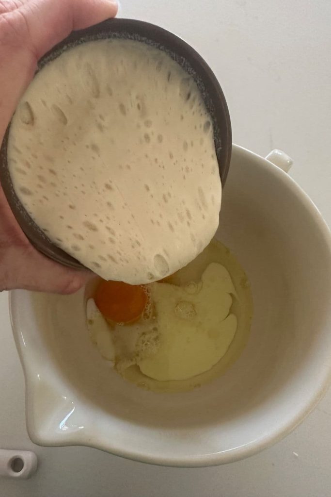 - Mix the sourdough starter, eggs, milk and oil in a bowl. Whisk together until well combined.