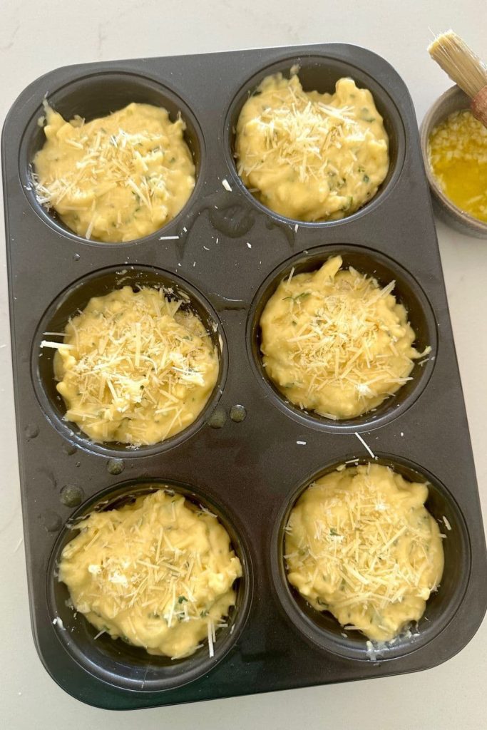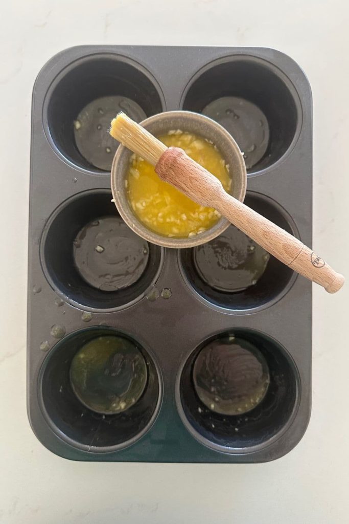 - Add melted butter and diced garlic together and use a pastry brush to grease the muffin holes with the garlic butter. Set aside.