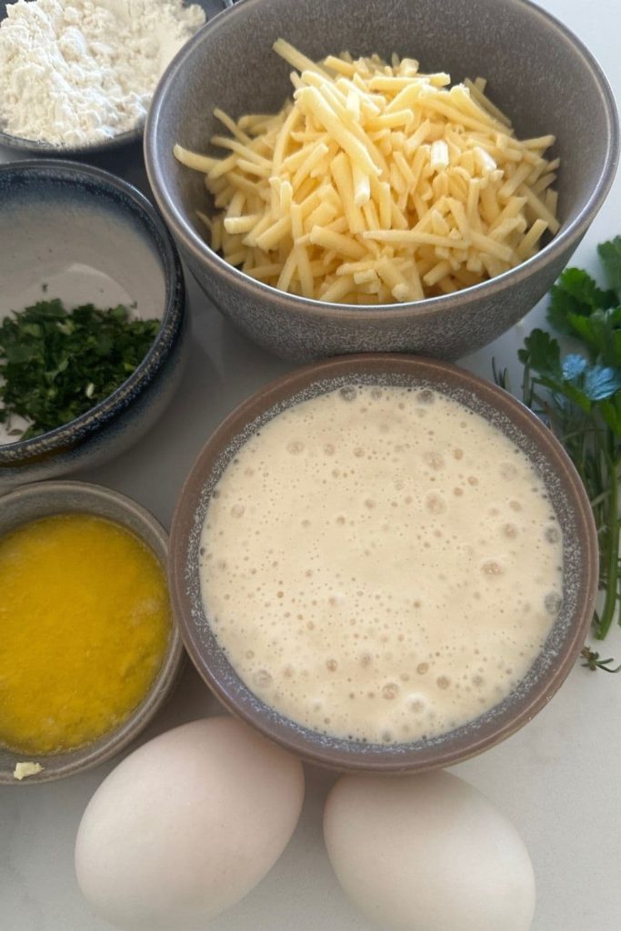 - In a separate bowl mix together shredded cheese, all purpose flour, salt, baking powder, salt and chopped herbs. Make sure that the cheese is completely coated in flour.