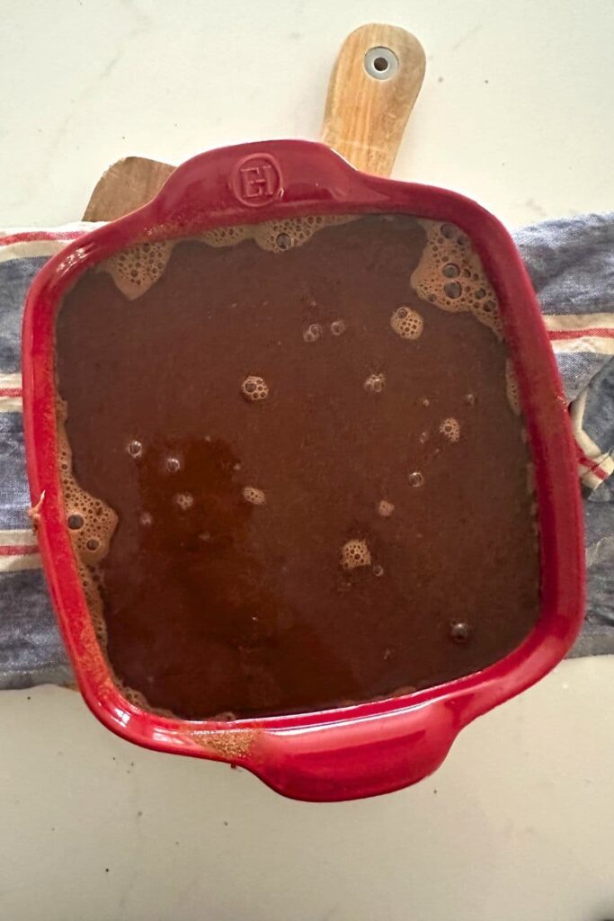 The biggest tip I can give you in terms of the success of this sourdough chocolate pudding is to not stir the butter into the batter! Let it sit on the bottom as this is what brings the sauce together in a rich, fudgy way.