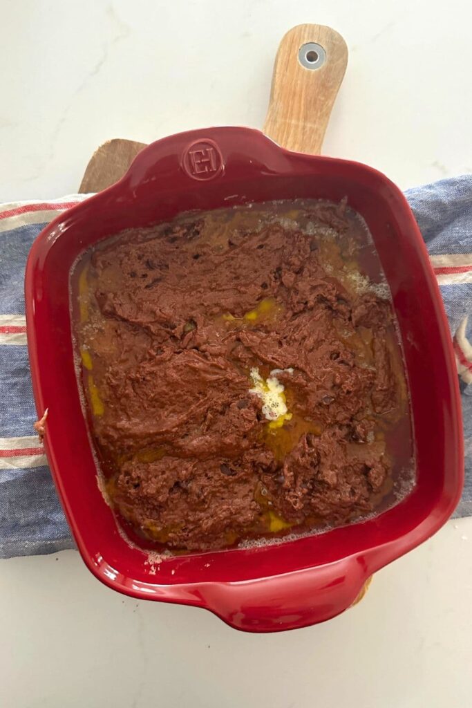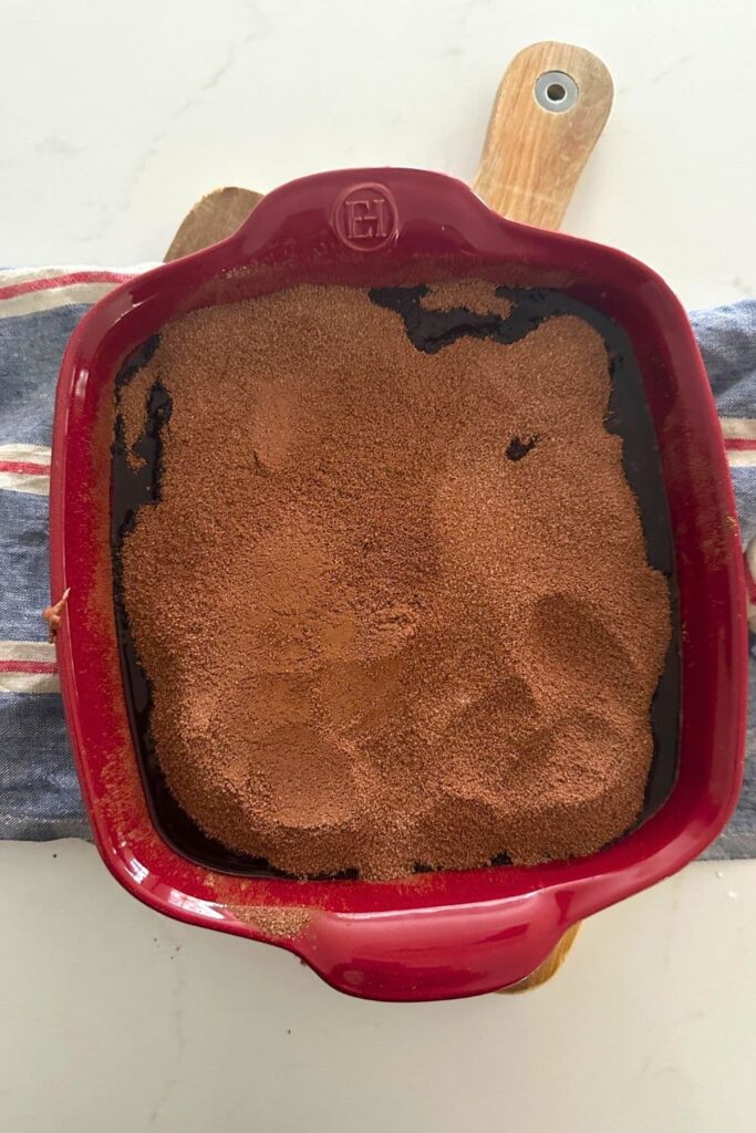 - Now, grab the sugar and cocoa powder mixture you prepared earlier and sprinkle this over the top of the batter in a thick layer. Do not stir it in, let it sit on top of the batter (it's ok if some of it falls down the sides into the pool of melted butter).