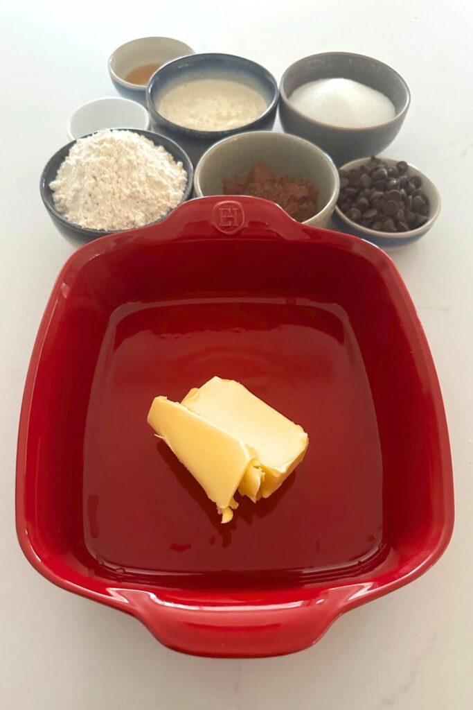 Take your baking dish and place the butter into it. Put the dish into the oven and allow the butter to melt.