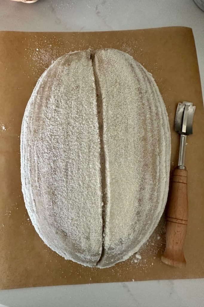 Gently score your bread with a clean razor blade or knife. At minimum a large cross is sufficient, but you can get as artistic as you like. You can find my full guide on how to score sourdough bread here.