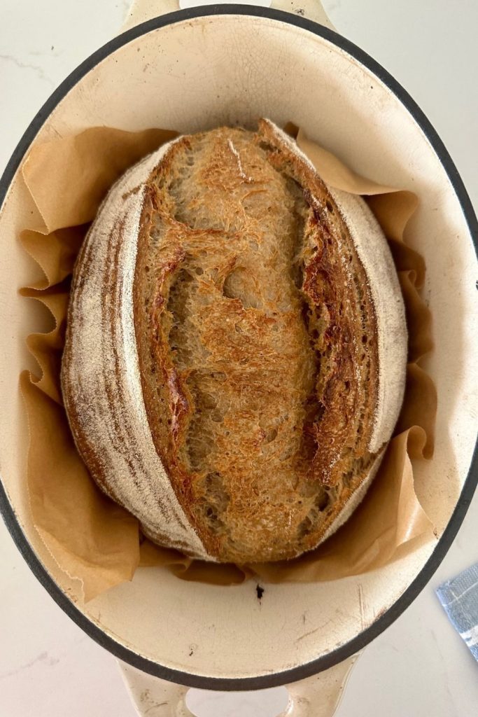 - Notes on Baking: If you're worried about the base of your bread burning, place a baking sheet on shelf underneath your Dutch Oven - it works! If you're worried about your bread not being cooked all the way through, turn the oven off and place your dough straight onto the oven rack. Leave the door ajar and let your bread rest there for a few hours. Make sure you don't close the door or your sourdough will sweat and you'll get a wrinkly, soggy crust. Remember not to cut into your loaf too soon - you'll need to let it cool for at least a few hours (4-6 is best).
