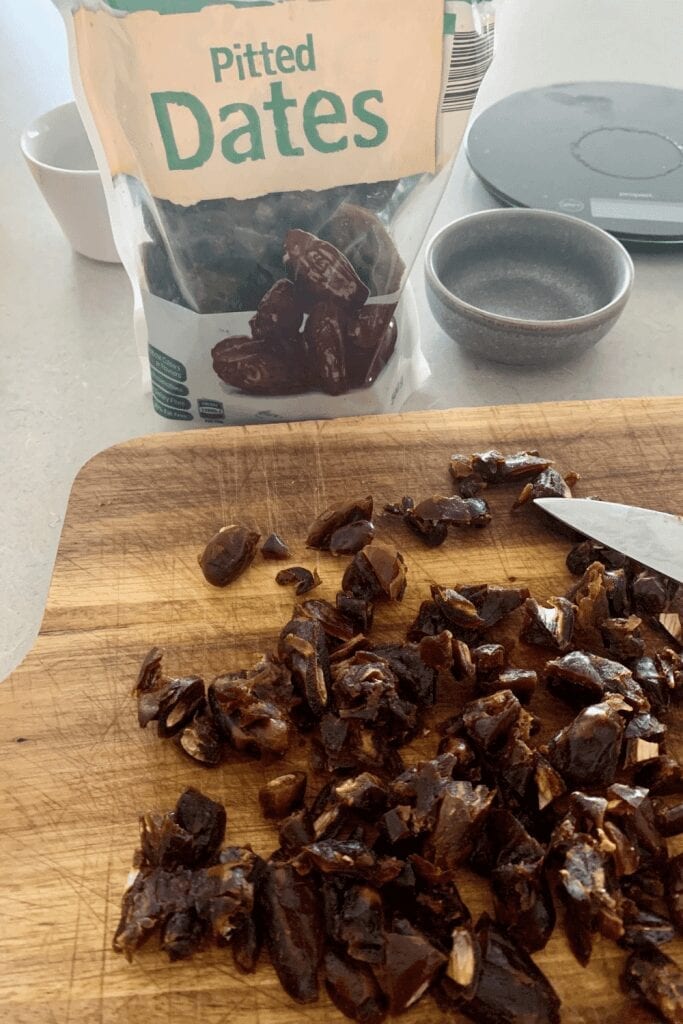 - Chop the dried and pitted dates into smaller pieces. You can just chop them roughly, they don't have to be perfect.
