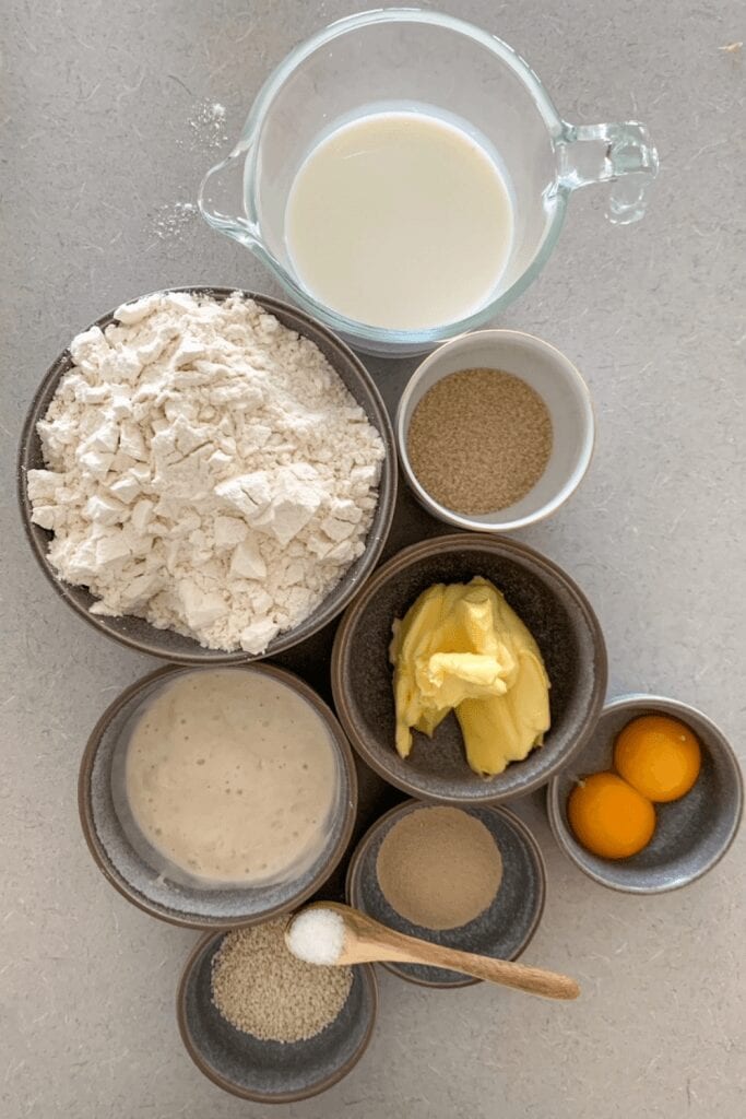 9 simple ingredients combine to make these sourdough buns. You'll more than likely have these on hand - flour, milk, eggs, butter, sugar, yeast, salt, unfed sourdough starter and sesame seeds.