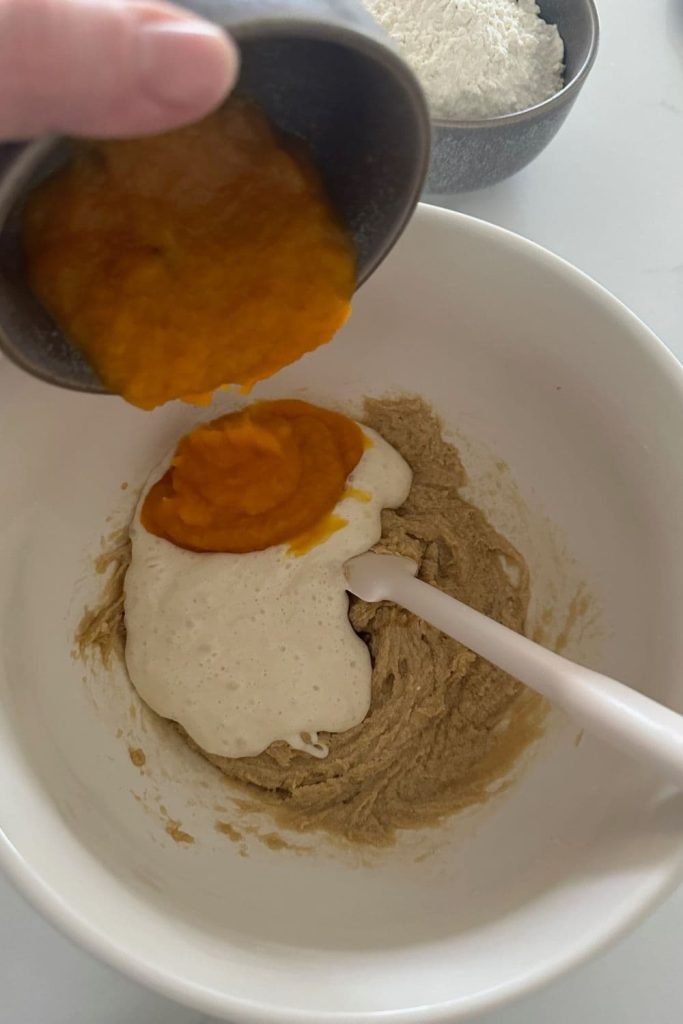- Now add your sourdough starter, pumpkin puree and vanilla to the butter mixture and whisk through until really well combined. The batter should be light and fluffy.