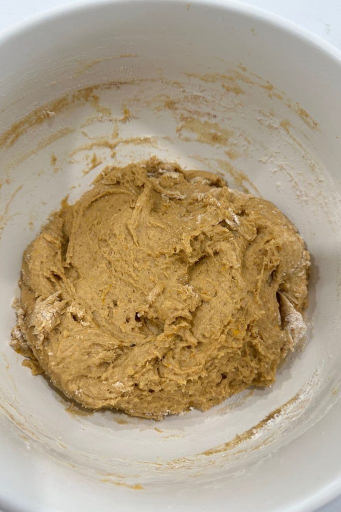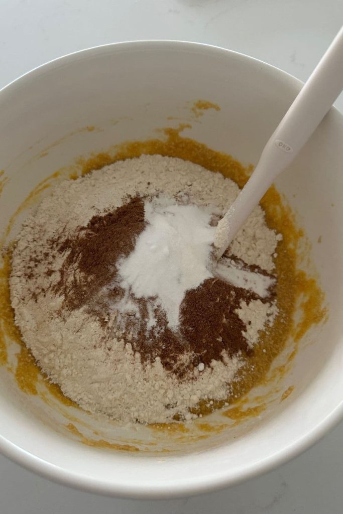- On top of this, add the all purpose flour, baking soda, baking powder and spices. Mix well to combine and form a cookie dough.