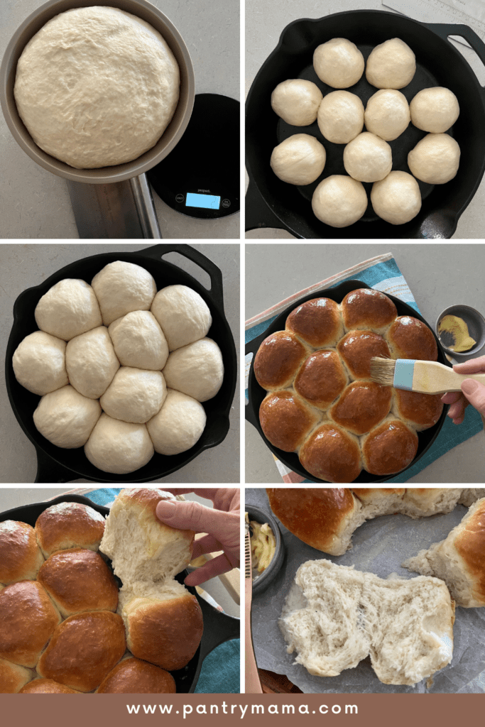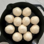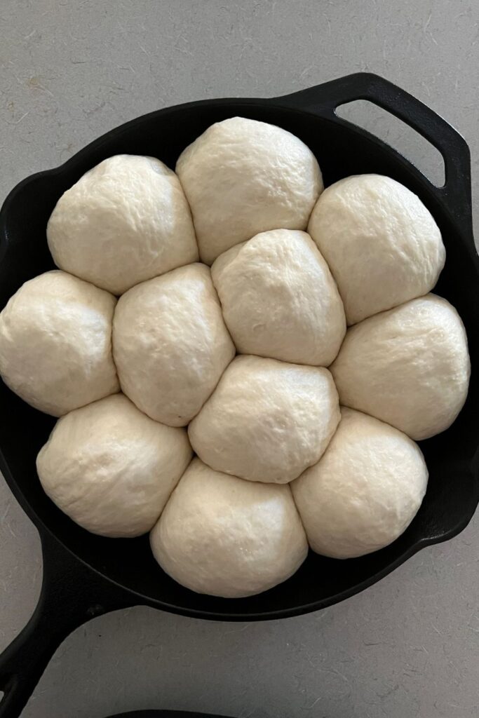 - Shape each piece of dough into a ball and place the balls of dough into a cast iron skillet (see notes for options).