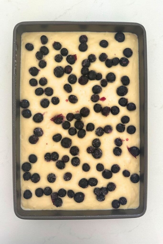 Pour the pancake batter into the prepared sheet pan. Add blueberries to the top of the pancake batter (this is optional - you can make them plain if you prefer).