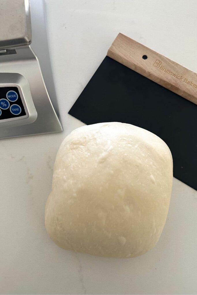 - Once the dough is ready, separate the dough into smaller balls so they are ready to be rolled out. I find around 80g to be the perfect size. The easiest way to do this is to flip the dough onto your counter, making sure the sticky side is facing up. Use a metal dough scraper to gently cut chunks of the dough away. Gently form into loose balls.Leave the balls on your counter top, covered with a tea towel, for around 30 minutes to allow the gluten to relax (see notes for more info).