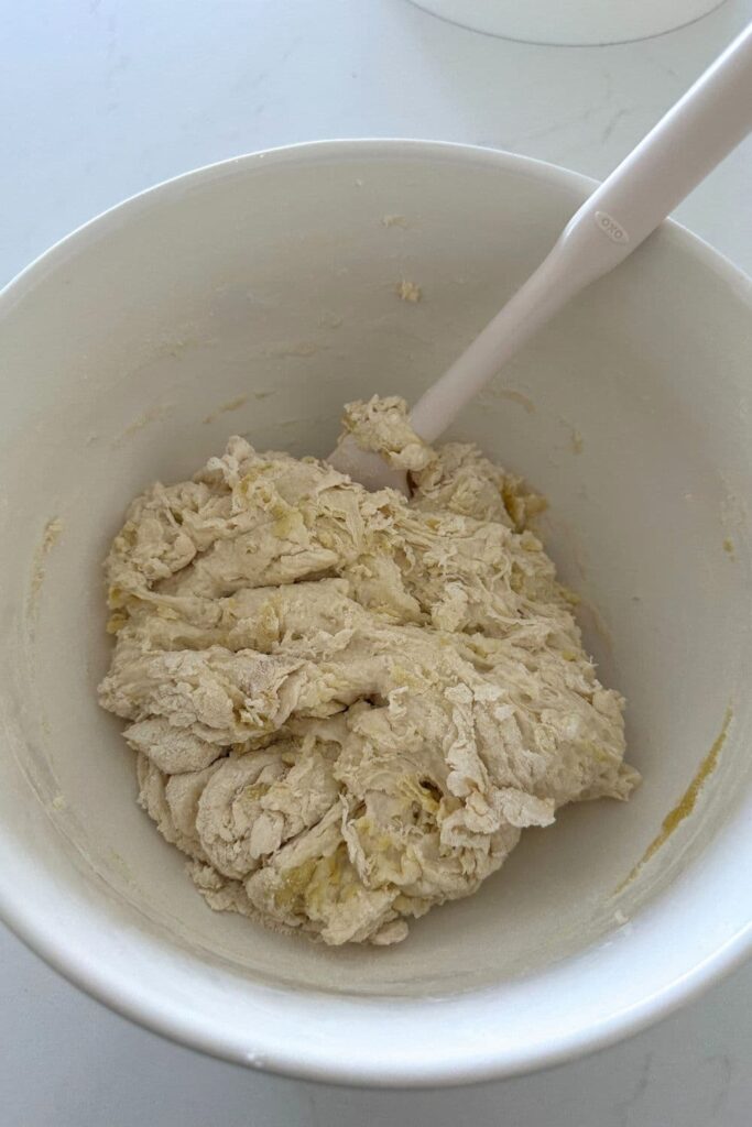 - Measure out all of your ingredients into a large mixing bowl. You don't have to pre mix, you can just add them all in on top of one another. This dough is extremely forgiving.Gently combine all the ingredients so it forms a shaggy dough. Let the dough sit covered for around 30 minutes.