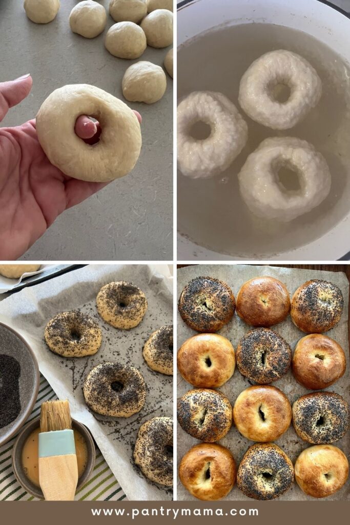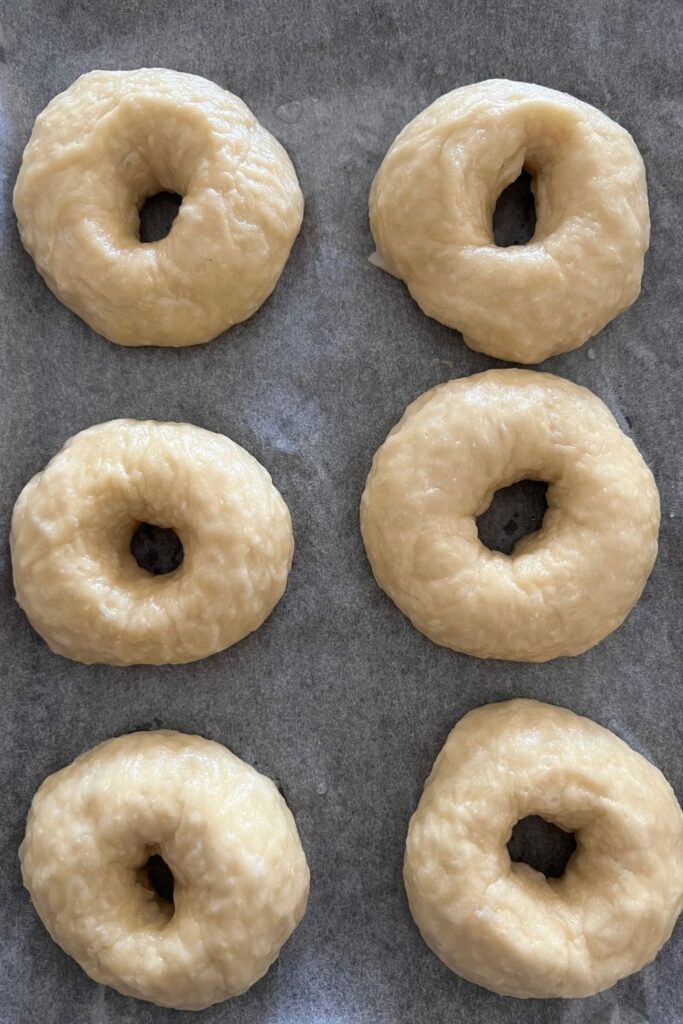 Boiling the egg bagels before baking them allows them to puff up so that they are already partly cooked when they hit the oven.