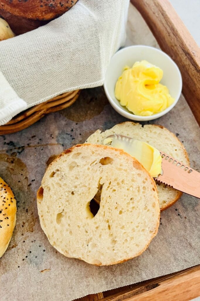 This sourdough egg bagel recipe uses eggs to add protein and fat to the bagel dough which results in a more tender crumb.