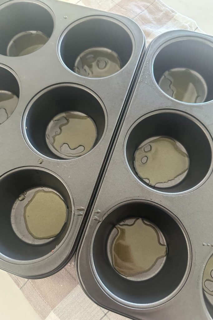 Rub your hands with a little olive oil and push each portion of dough into a muffin hole. Try to spread it across the bottom of the hole, but if you can't it will fill up as it rises again. It might seem like there's a lot of oil, but this is what will give you sourdough focaccia muffins their crispy, golden exterior when baked.