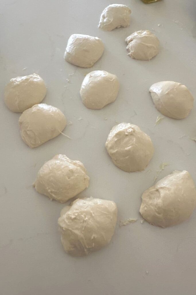 Once the dough has risen, you need to split it into 12 evenly sized portions. This can be a little messy, but my best advice is to use plenty of olive oil.