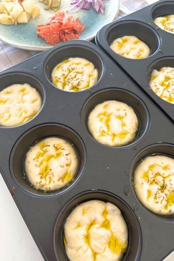 - Rub your hands with a little olive oil and push each portion of dough into a muffin hole. Try to spread it across the bottom of the hole, but if you can't it will fill up as it rises again.