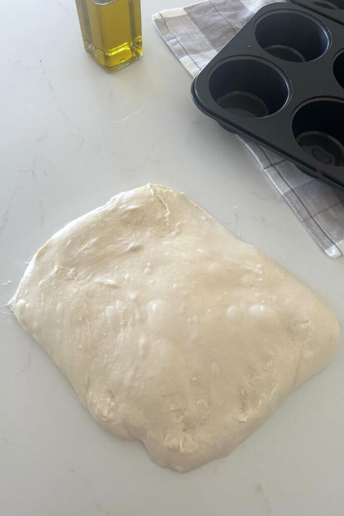 - Bulk Ferment:Now you want to leave your dough to ferment. Cover it with a tea towel or plastic wrap and leave it alone to rise around 30%. I only allow the dough to rise a bit because you don't want super sticky, over fermented dough when you go to shape it into 12 smaller pieces (it's much harder than when you just need to tip the focaccia dough into a tray like you would normally).Focaccia is super forgiving so it doesn't need to be perfect!