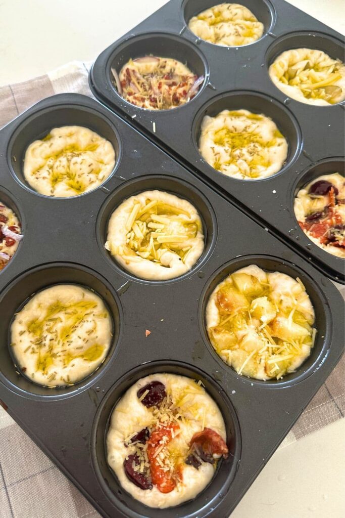 Pick n Mix Toppings - I think the the best thing about these sourdough focaccia bread muffins is that you can create a selection of toppings to suit everyone. Make 12 different flavors, or 6 of each or 3 of each ... you get the idea!