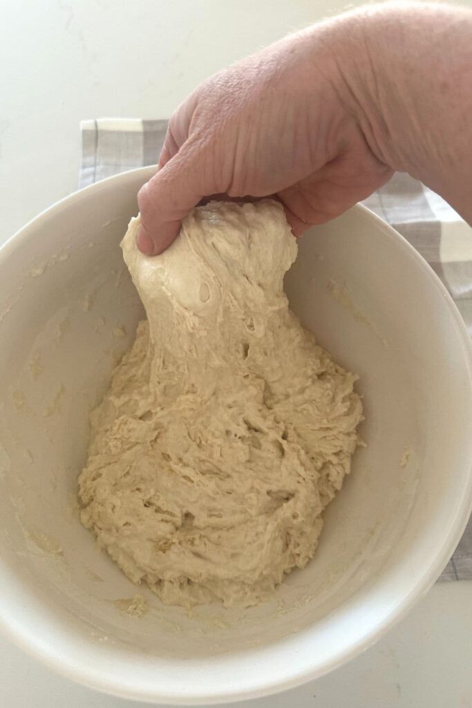 - Mixing The DoughWeigh out your sourdough starter and water into a large bowl.Mix the water and starter together briefly. Then add flour and salt and mix whole lot together until it forms a sticky dough. You don't want any dry flour left at all.You can use a dough scraper or Danish dough whisk for this process.