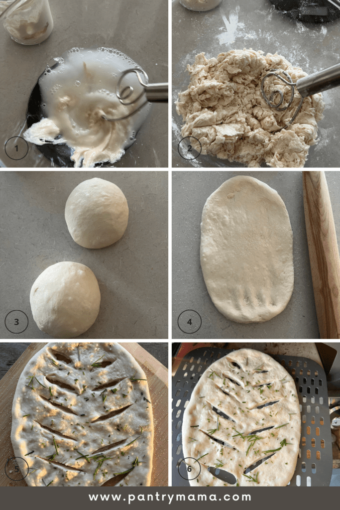 For this schedule, you also need a fed and bubbly starter, but with this timeline you could feed it when you get up and it will be ready to mix with the dough around 11am. This timeline would be perfect if you want to serve your warm sourdough fougasse at a brunch table.