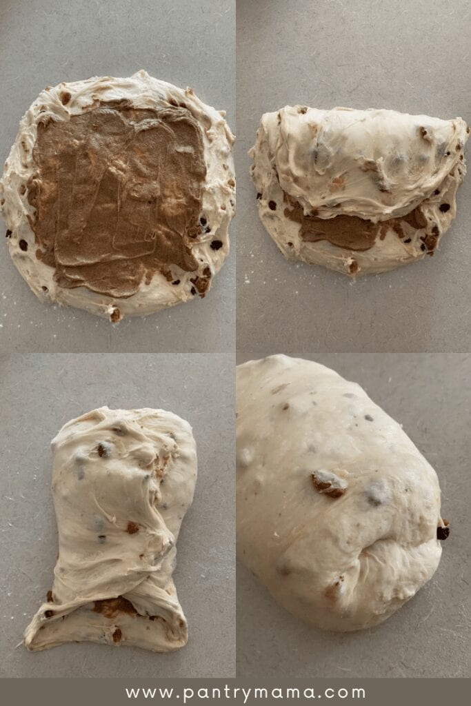 - Shaping Your Dough:Once your dough has finished its first ferment, it's time to give it some shape and surface tension. This loaf is a little different in that you will now add some cinnamon to the dough before you shape it. I think this recipe lends itself to a batard however it's completely up to you what shape you would like.Before you shape your dough - mix the butter, cinnamon and all purpose flour into a paste. Set aside.Ease your dough out of the bowl with the smooth side on the counter and the sticky side up. Pull it into a loose rectangle and spread with the butter and cinnamon mixture. Be careful to leave a border around the edges so that when you shape it the cinnamon is contained and does not leak out of the dough.Once you have shaped your loaf, make sure you tension the dough tightly to ensure that the cinnamon does not leak out. Place it into a floured banneton.If you need help with shaping, you'll find instructions for a batard here and boule here.