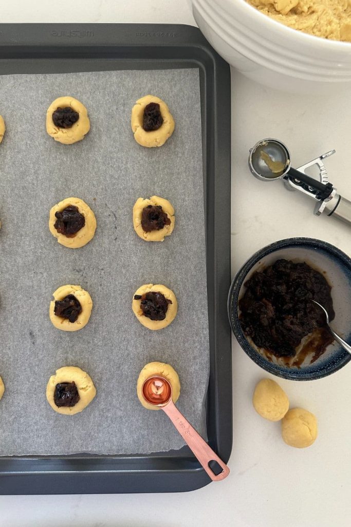 - Use a small spoon to place a little fruit mince into the indent in each cookie. You don't want to overfill them or they will make a mess in the oven.