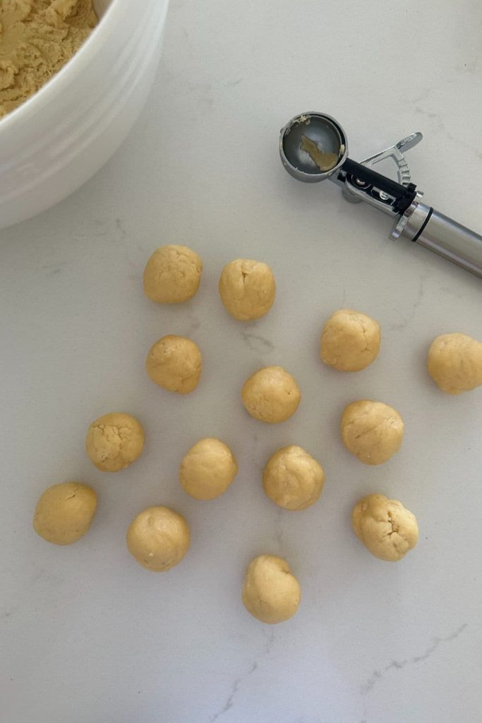 - Use a tablespoon or cookie scoop to scoop out balls of dough. Roll the balls a little and place them onto the prepared baking trays. I find the balls are perfect around 15g each, but you can go up to 20g.