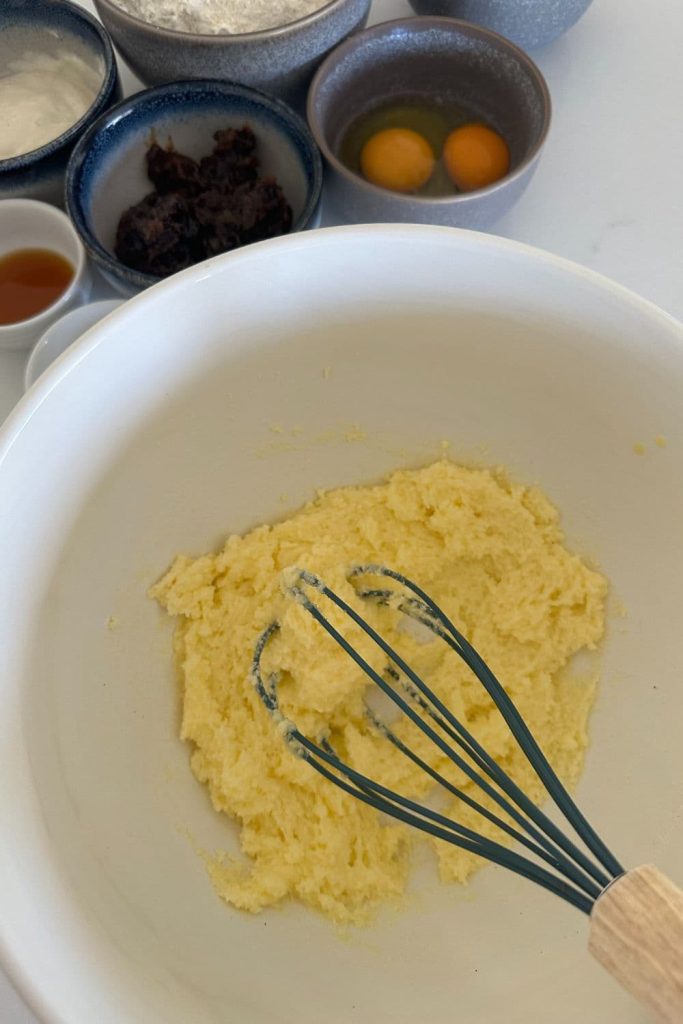 In a large mixing bowl, add the butter and sugar. Cream the softened butter and sugar together using a whisk.