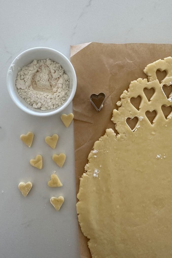 A little tip - I found this easiest to do with a small round cookie cutter. The heart cutter that I tested was time consuming as I had to use a skewer to get the dough out of the heart for each cracker whereas I could just use my finger for the round cutter).