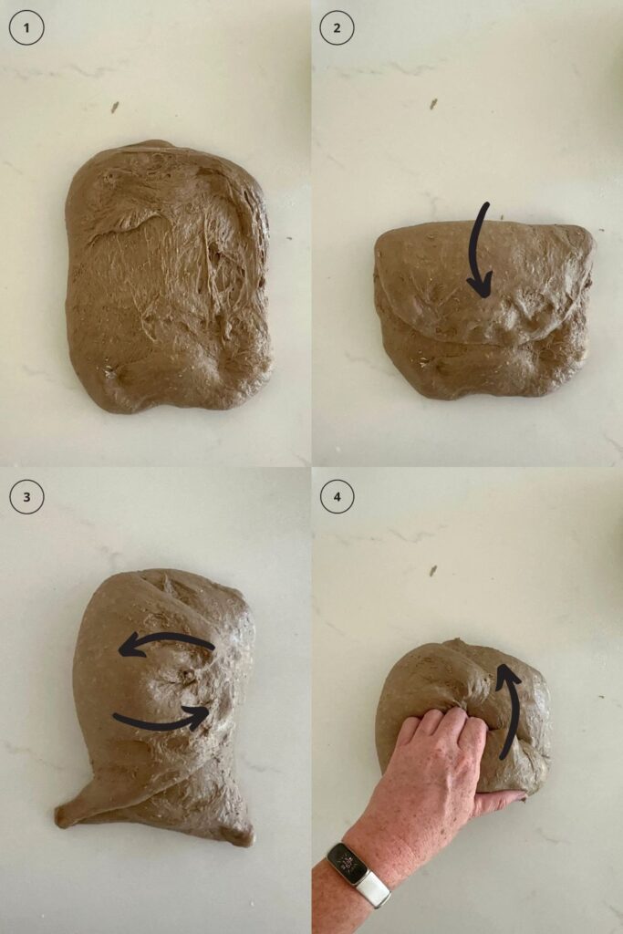 Aim to do around 4-6 sets of stretches and folds. For each set, stretch the dough up and over itself 4 times. Leave around 15 minutes in between each set. Again you do not have to be exact with time, but you need to do at least 4 sets over 2 hours.