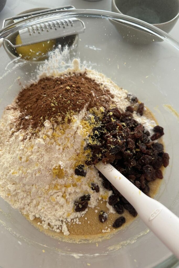 On top of the liquid ingredients, add the all purpose flour, baking powder, spices, lemon zest and raisins. Fold together until it forms a thick, wet dough.