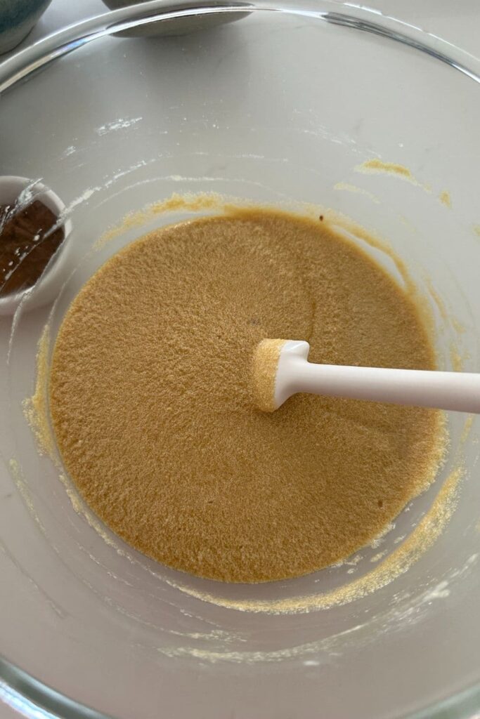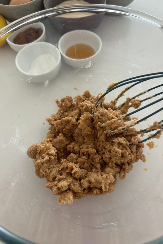 - Add the butter and brown sugar to a large mixing bowl and whisk until it looks a bit like wet sand.