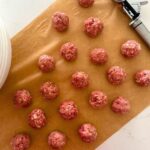 - Using a cookie scoop, make small balls of dough (approx. 30g), rolling them gently and placing them onto the cookie trays with a bit of room between each one.
