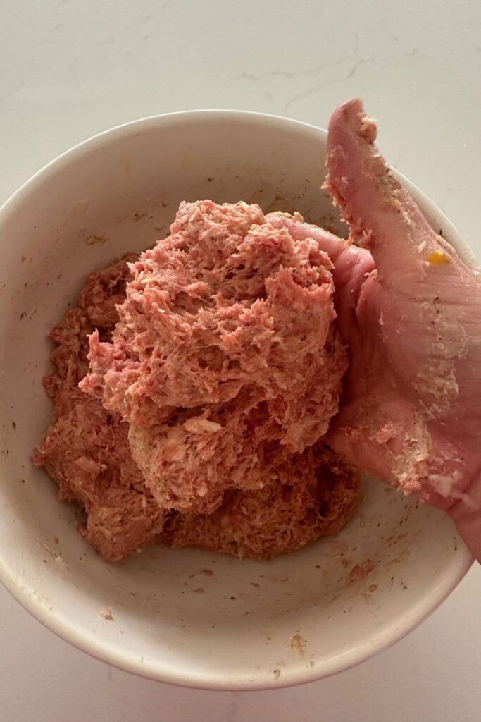 Using a wooden spoon (or preferably clean hands) thoroughly mix all of the ingredients together. Really work the sourdough discard and egg yolks through the ground meat.
