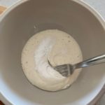 - Take your sourdough discard, add it to a bowl along with the baking powder and a little of the seltzer (carbonated) water. Use a fork or whisk to thin the discard out until it's like a thin pancake batter.